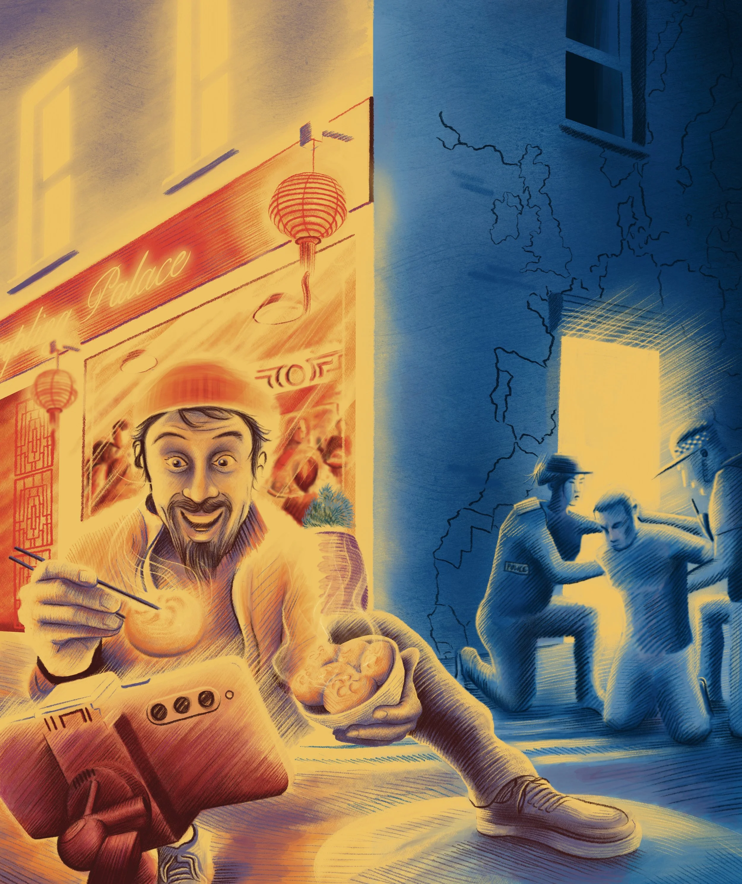 Feature illustration for The London Standard article “The Illegal truth behind some of London’s Top Restaurants.” Half-a-million-pound fines. Repeated raids. And a secret illegal workers underground world propping up the capital’s most-hyped dining spots. Rachael Burford investigates.